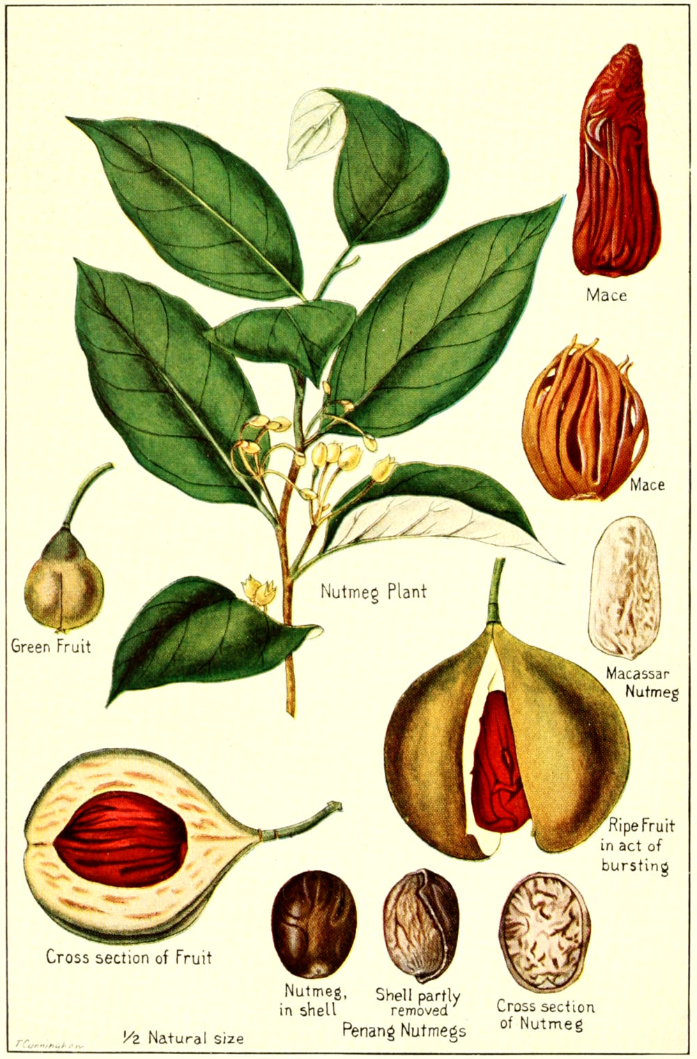 The Nutmeg-tree, genus Myristica (natural order Myristicaceæ), native of the Malay Archipelago, usually grows to a height of twenty to thirty feet. While the greater part of the world’s supply of both Nutmegs and Mace comes from the Banda Islands, the West Indies are by no means to be overlooked.